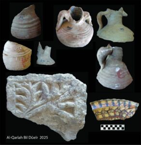 وأوضح الأستاذ وليد السيد رئيس البعثة الأثرية، أن البعثة عثرت بالموقع على عدد من اللقى الأثرية، من بينها أمفورات كانت تُستخدم في التخزين، تحمل بعضها كتابات يُحتمل أن تكون حروفًا أو أرقامًا أو أسماء مدونة على أكتافها، إلى جانب مجموعة من الأوستراكات تحمل كتابات باللغة القبطية، وعدد من أدوات المعيشة، وكسَر حجرية تمثل أجزاء من عناصر معمارية، بالإضافة إلى أجزاء من لوحات من الحجر الجيري منقوش عليها كتابات بالخط القبطي.