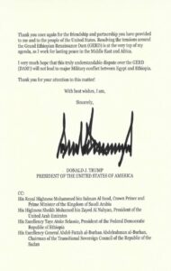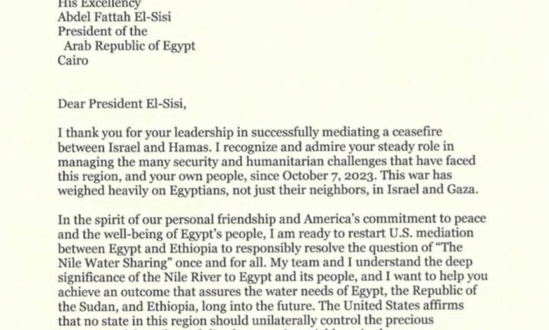 انطلاقاً من روح صداقتنا الشخصية والتزام أمريكا بالسلام ورفاهية الشعب المصري، فأنا على استعداد لاستئناف الوساطة الأمريكية بين مصر وإثيوبيا لحل مسألة “تقاسم مياه النيل” بشكل مسؤول ونهائي. يُدرك فريقي وأنا الأهمية البالغة لنهر النيل لمصر وشعبها، وأرغب في مساعدتكم على تحقيق نتيجة تضمن تلبية احتياجات مصر وجمهورية السودان وإثيوبيا من المياه على المدى البعيد. تؤكد الولايات المتحدة أنه لا ينبغي لأي دولة في هذه المنطقة أن تسيطر بشكل منفرد على موارد النيل الثمينة، وأن تُلحق الضرر بجيرانها في هذه العملية.