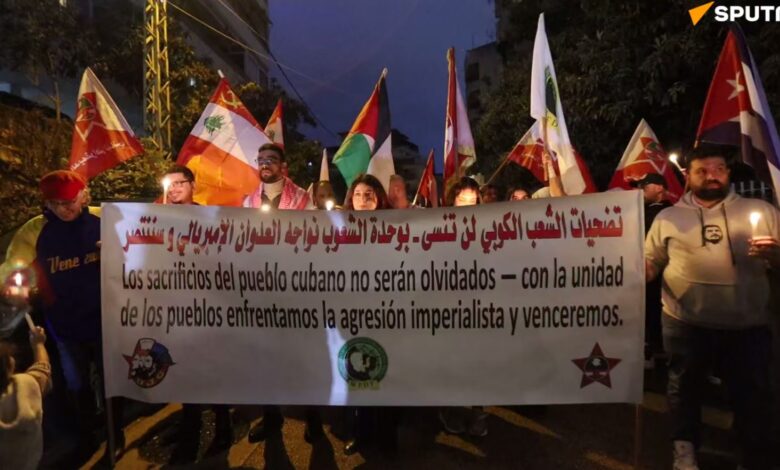 نظّم اتحاد الشباب الديمقراطي اللبناني، مساء امس السبت، وقفة تضامنية أمام السفارة الكوبية في بيروت، تخلّلها إضاءة شموع، دعمًا لكوبا واحتجاجًا على السياسات الأميركية تجاهها وتجاه فنزويلا، وفق ما أفاد منظمو التحرك.